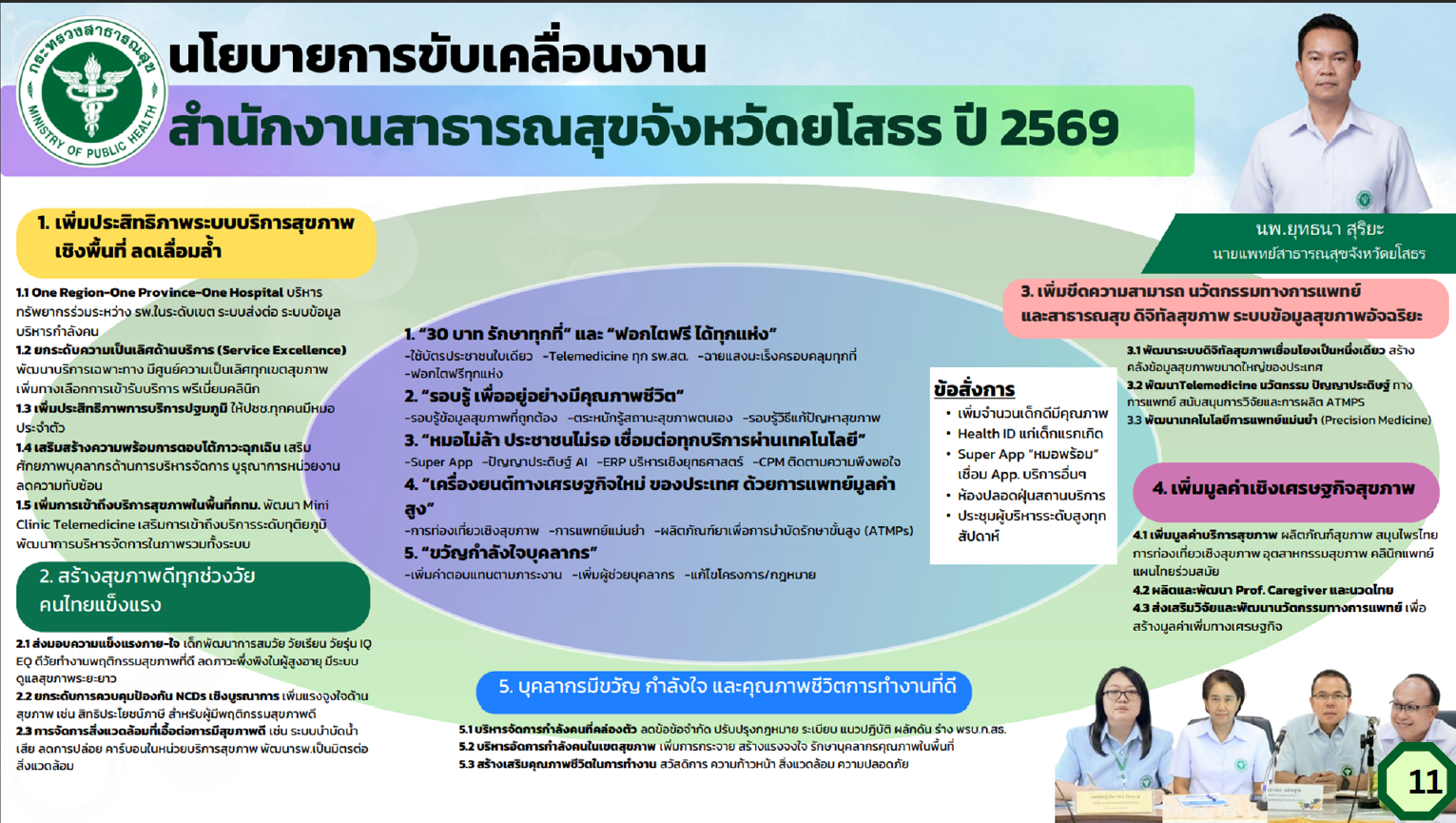 1.พัฒนาคุณภาพชีวิตของประชาชนชาวยโสธรทุกกลุ่มวัย โดยการส่งเสริมสุขภาพ การป้องกันควบคุมโรคและภัยสุขภาพ การลดปัจจัยเสี่ยงด้านสุขภาพ และบริหารจัดการสิ่งแวดล้อม อย่างมีประสิทธิภาพ